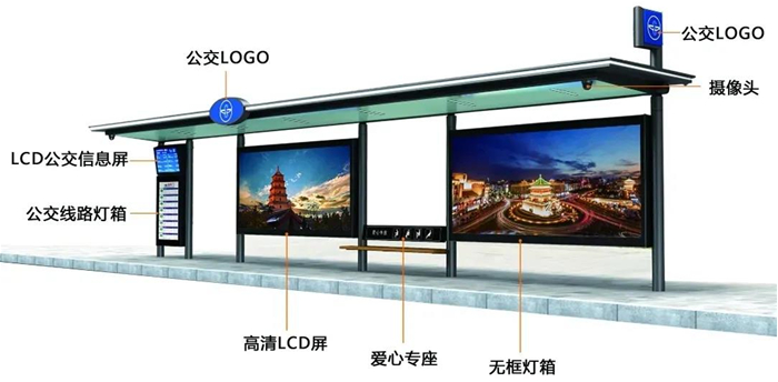 公交候車亭整體以黑色和綠色為主色,調(diào)頂棚可遮陽防雨兩端各安裝一個(gè)攝像頭,還配備了愛心座椅、高清LCD屏、LCD公交信息屏等設(shè)備,不僅顏值更加“高大上”也為城市增添了新景觀。